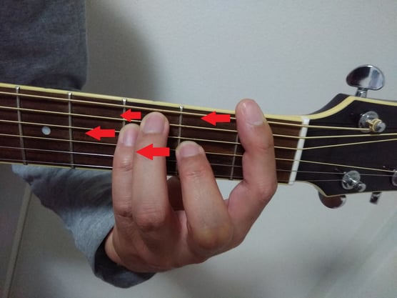 後ほどご説明しますが、中指・薬指・小指はなるべくフレットの近くを押さえることが大切です。そのためには人差し指と中指の間(赤い矢印が示す部分)を少なくとも上の画像の間隔ぐらいは離しましょう。