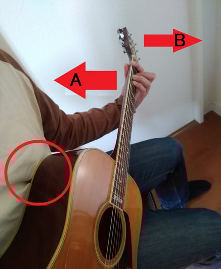 これは明らかに、私の胸部にギターのボディが強く当たってできたシワです。AとBの2つの大きな力は、左手をグッと引く力の方が大きくなります。その大きな力に、自分の腰と右手と胸部で押し返して対抗しているんです。