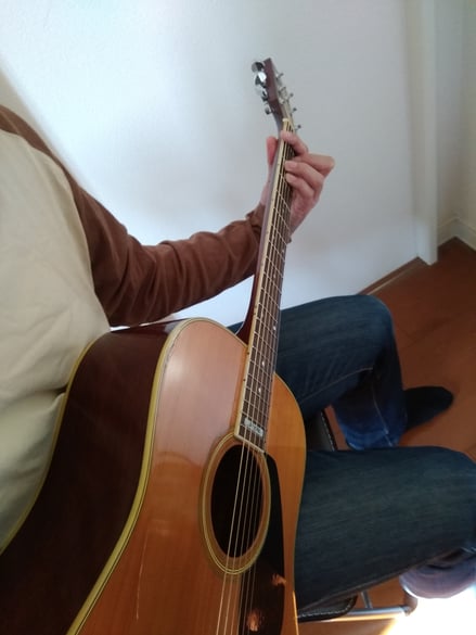 左手の形や押さえる場所を見たい時には、猫背になっても良いのでギターは立てたまま自分からのぞきに行きましょう。