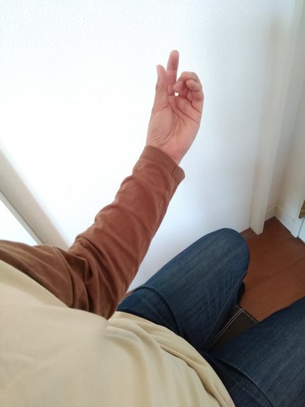 まず、ギターが無い状態でFコードを押さえる姿勢をとってみます。エアーギターですね。